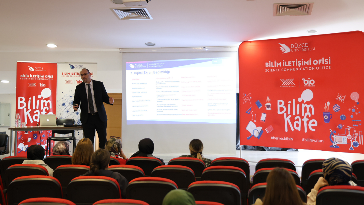 DMHA DÜZCE-Bilim Kafe etkinliği; Düzce Üniversitesi Bilim İletişimi Ofisi, Kadın Çalışmaları Uygulama ve Araştırma Merkezi (DÜKAM), Engelsiz Üniversite Koordinatörlüğü ve Toplumsal Katkı Koordinatörlüğü iş birliğiyle Düzce Özel Eğitim Anaokulu’nda gerçekleştirildi.3 Aralık Dünya Engelliler Günü farkındalık etkinlikleri ve 2025 Aile Yılı kapsamında düzenlenen programda Düzce Üniversitesi Engelsiz Üniversite Koordinatörü Dr. Öğr. Üyesi Hakan Özak, “Özel Gereksinimli Çocuklarda Problem Davranışların Önlenmesi ve İletişim Stratejileri” konusundaki bilgi ve deneyimleri katılımcılarla paylaştı.Aileyi, çocuğun dünyaya geldiği andan itibaren ilk ve en önemli öğrenme ortamı şeklinde tanımlayan Dr. Öğr. Üyesi Hakan Özak, çocuğun kişiliğinin, davranışlarının, duygusal yapısının ve sosyal becerilerinin büyük ölçüde aile içinde şekillendiğinin altını çizdi.
